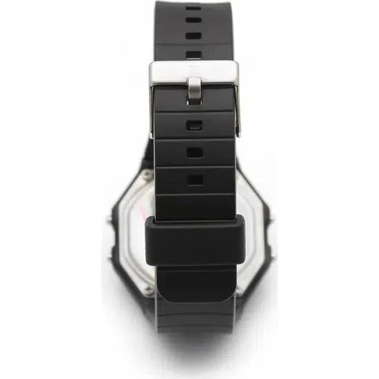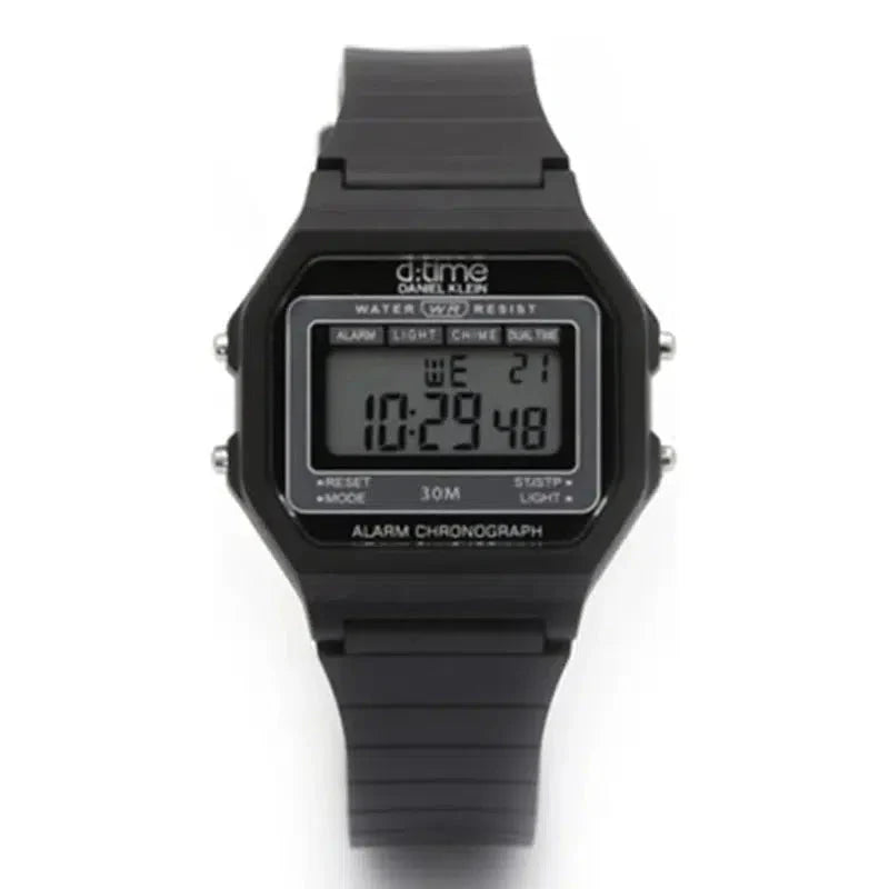 Style: Fashion Casual; Collection: D Time; Type: Ladies; Display: Digital; Mechanism: Quartz; Mechanism name: Jp25 4.5; Mechanism origin: Japanese; Water resistance: 5 atm; Indication: Hour, minutes, seconds, Date, Day of the week, Time in 12/24 format, Stopwatch, Alarm; Dial color: Green; Glass material: Mineral crystal; Dial reading type: Digital; Case shape: Octagonal; Case material: Plastic; Case color: Black; Case size: 33 mm; Case thickness: 9 mm; Strap/bracelet material: Silicone; Strap/bracelet color: Black; Inner strap/bracelet color: Black Closure system: Standard buckle; Strap/bracelet finish: Matte; Stopwatch: Yes; Calendar: Yes ;Date: Yes;Day of the Week: Yes;Alarm: Yes;Lighting: Yes;Dual Time: Yes;Other details: Logo on dial, back cover, Mechanism accuracy: ± 20 Sec/Month